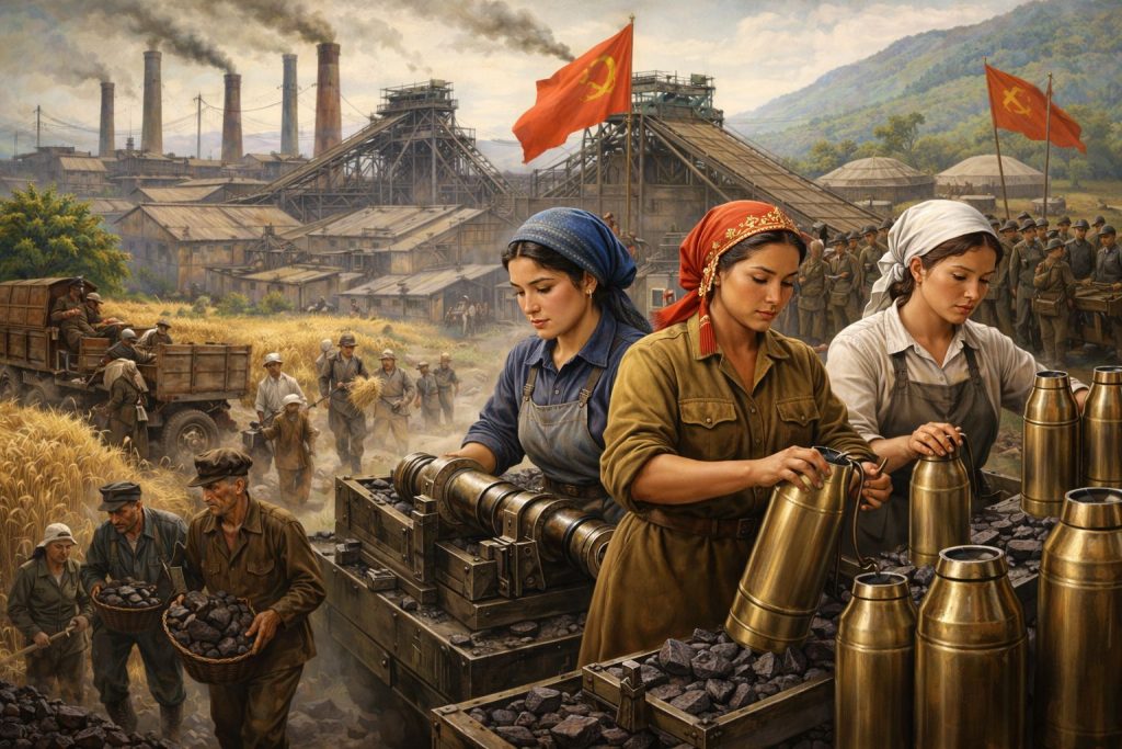 В годы войны Казахстан стал надёжной опорой страны. Сюда эвакуировали заводы, научные институты, сюда прибывали тысячи специалистов и их семьи. Здесь, вдали от линии фронта, круглосуточно работали люди — женщины, подростки, пожилые — понимая, что от их труда зависит жизнь солдат и исход войны.